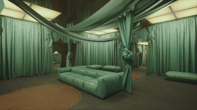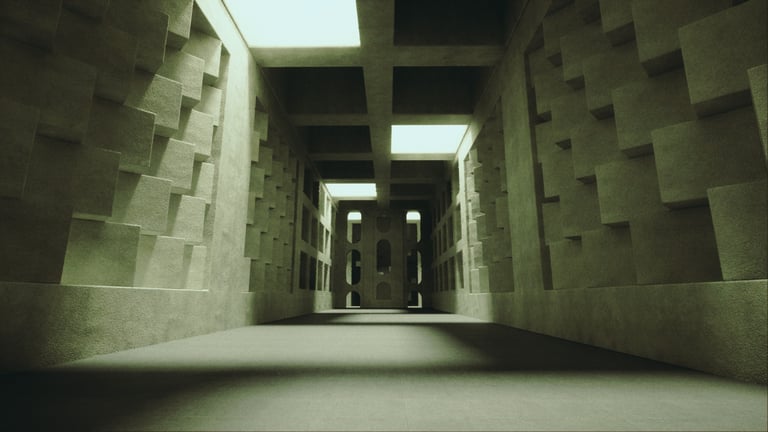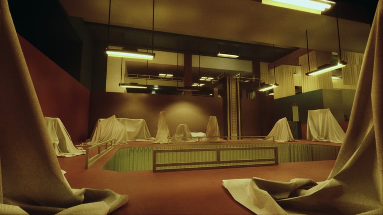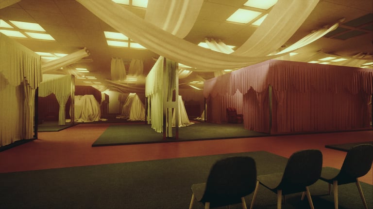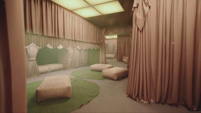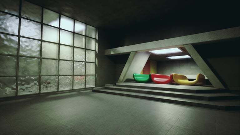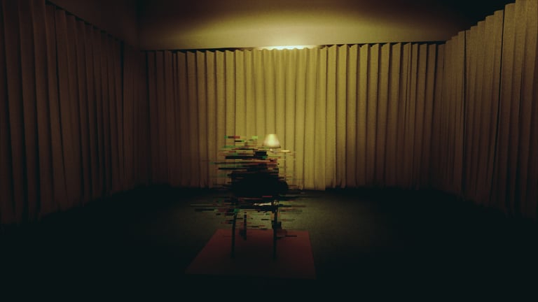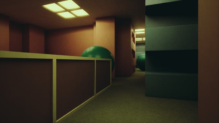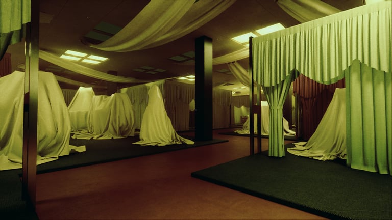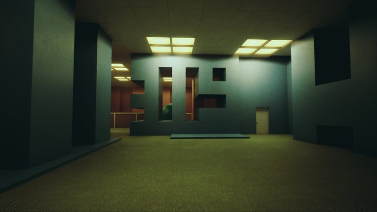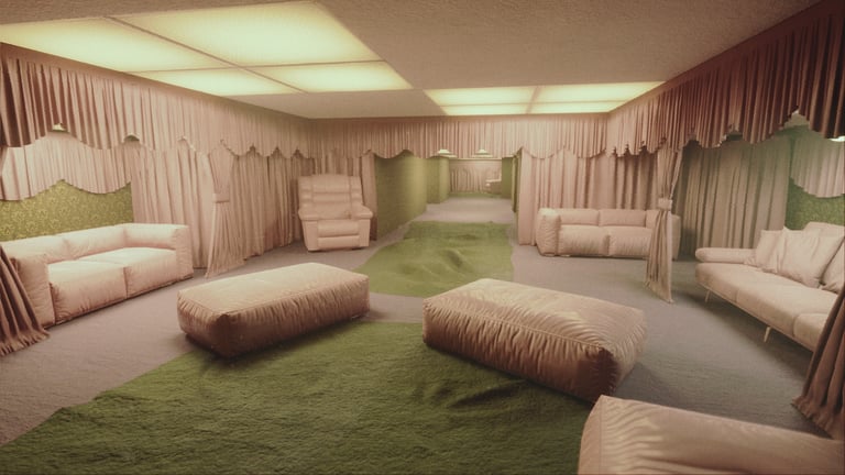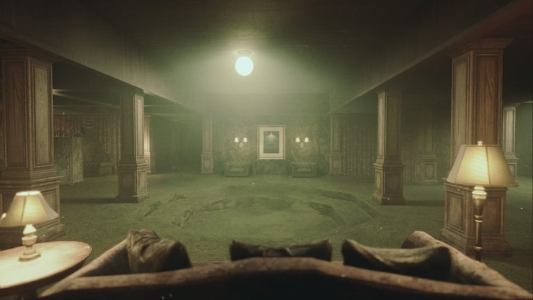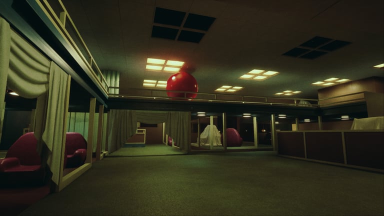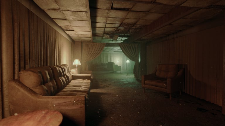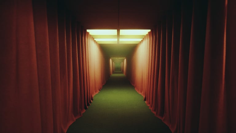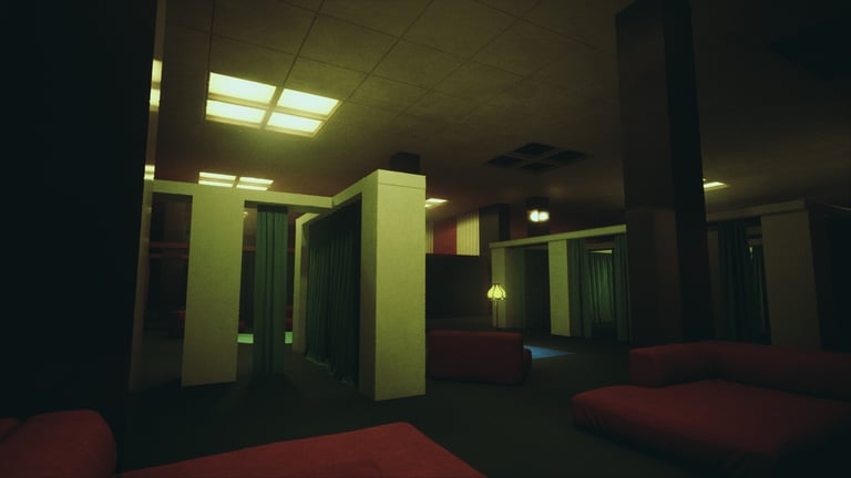 Lost in an eerie labyrinth of dated carpet and walls coated in lead paint, you feel the weight of an unknown purpose. The hum of flickering lights, swaths of heavy curtains, and faded furniture from a long ago decade evokes nostalgia laced with dread. Is something waiting around the corner? Or are you merely slipping deeper into the depths of a psychological mire? Find out—if you dare.